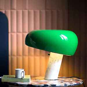 La lampe Snoopy de la marque italienne Flos associe une base en marbre blanc à un abat-jour en métal émaillé et un disque en verre épais qui diffuse une lumière douce. Cette lampe de table à la fois élégante et joviale a été nommée en l'honneur du chien Snoopy des Peanuts avec une silhouette caractéristique ressemblant à celle d'un beagle.